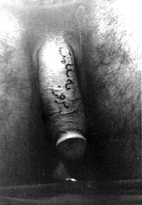 Pero el caso más curioso de Priapismo (erección prolongadísima con elevados riesgos para la salud) se dio en el pene de un joven de 21 años con dos tatoos (ver imagen superior):