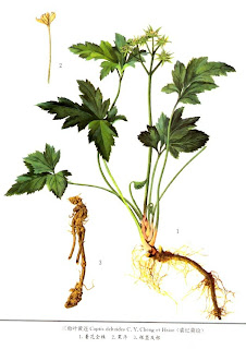 En el artículo nos habla de Panax ginseng, Epimedium brevicornum, Rubus coreanus, Angelica sinensis, Eucommia ulmoides, Eodia ruteacarpa, Rodiola sacra, Tribulus terrestris, Psoralea coryilfolia, Cnidium monnier, Gingko biloba, Ligusticum chuanxiong y Coptis chinensis ( Todas estas plantas las hemos visto extensamente en el BLOG). De Coptis chinensis (ver foto) el estudio nos habla que es rica en berberina. Y de Ligusticum contiene tetrametilpirazina, también vasodilatadora: