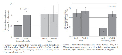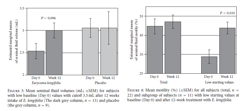 Y en el estudio participaron 109 hombres en 30 y 55 años a los que se dividió en varios grupos ( siendo el más efectivo el grupo de 300 mg/dia) y se comprobó que aumentaba su volumen de esperma, movilidad de los espermatozoides y mejoraban su indice internacional de función eréctil (IIEF):